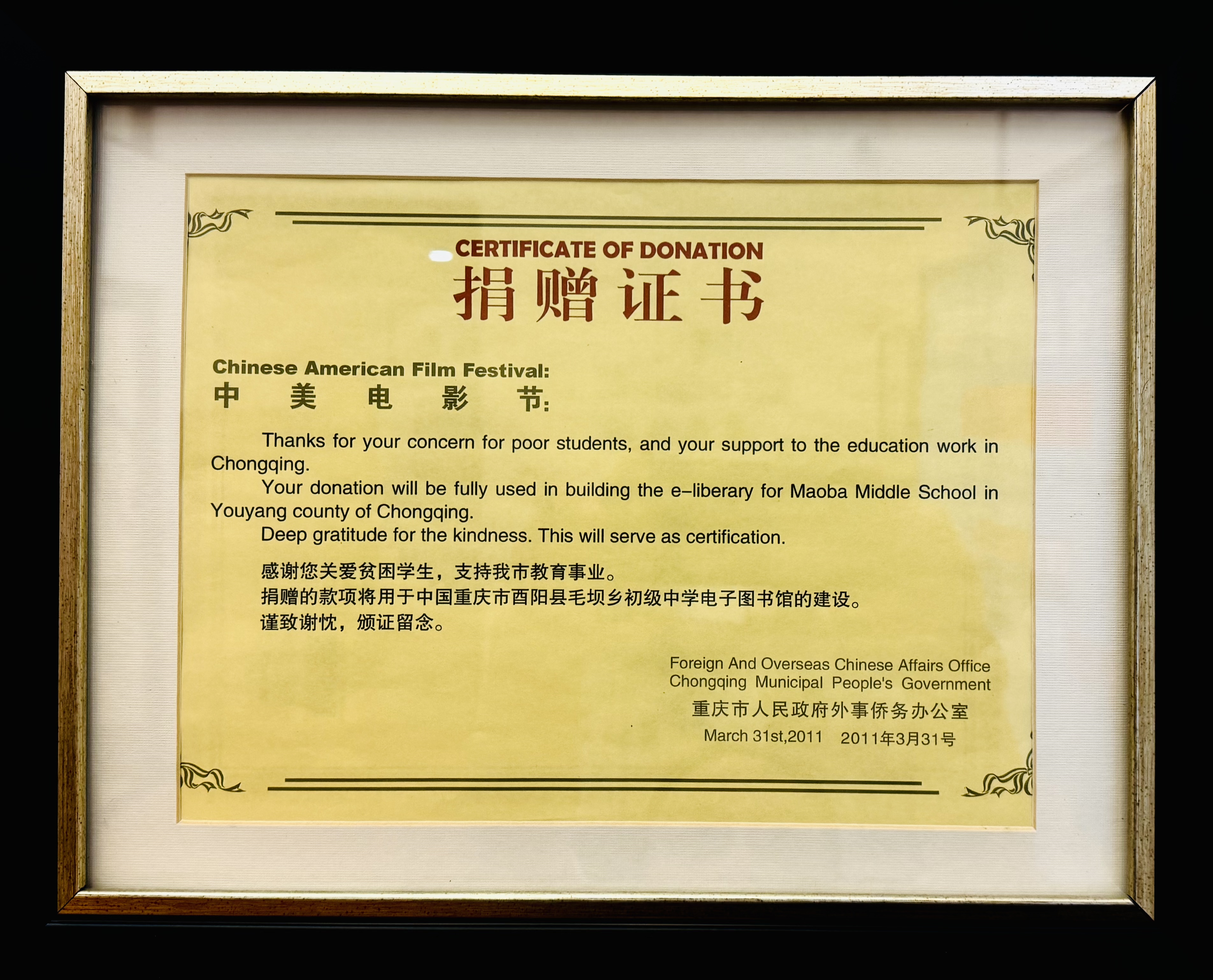 From the years 2009 – 2012, one of AACAF’s earliest activities was the development of e-libraries in rural regions of China. To ensure equal opportunity to education, AACAF raised funds to allow the under-resourced youth of these cities to access the Internet freely for the first time. In 2009, an e-library was built in Xiuqi Middle School in Chongqing Province, China. In 2010, construction on the e-library in Maobo Town Middle School in Chongqing Province, China. In 2011, the construction of the Maobo Town Middle School E-Library was completed. In 2012, an e-Library was constructed at Mianyang Shuanghe Middle School in Chongqing, China.